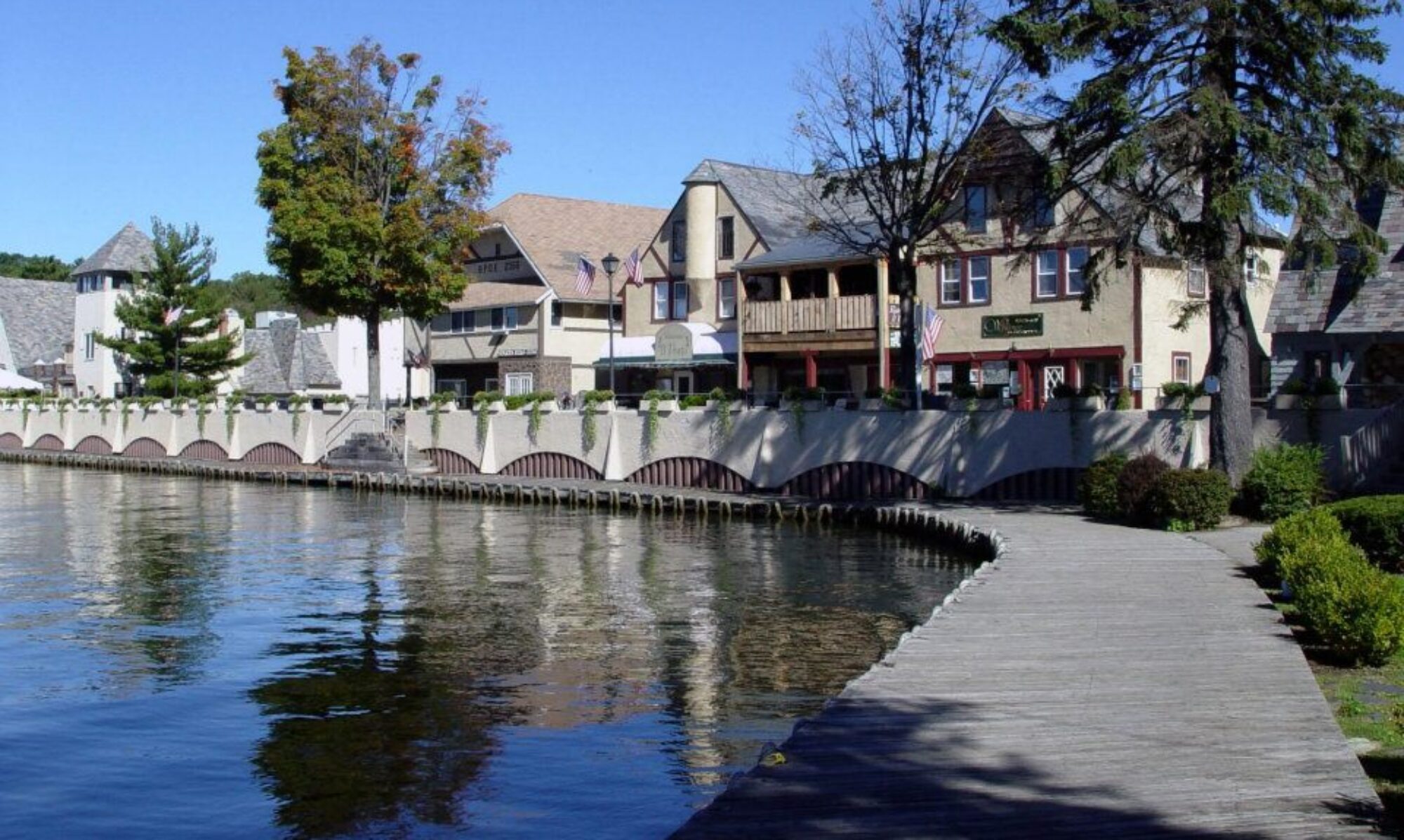 The Wallkill River was dammed in 1926 to form Lake Mohawk, creating the center of a resort community. Lake Mohawk is the largest private man-made lake in New Jersey at 800 acres. White deer Plaza on the lake was named after Princess White Deer, a Mohawk princess who attended the opening. In the 30s, The Plaza expanded, as did the community of private homes surrounding the lake. In 1988 the Plaza, Country Club and surrounding buildings were added to the National Register of Historic places because of it’s unique “Lake Mohawk Tudor” architecture.
